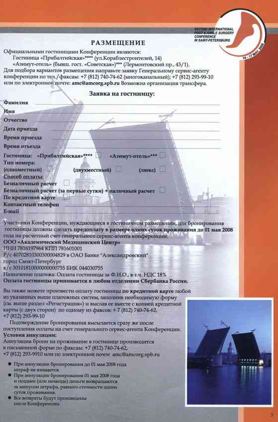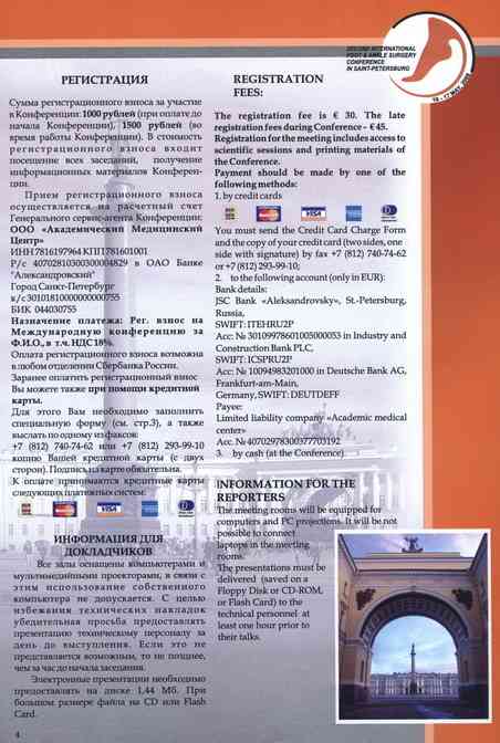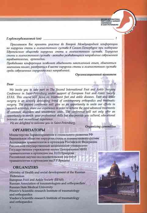 Уважаемые коллеги! Рад сообщить Вам о том, что в Санкт-Петербурге 16-17 мая 2008 года состоится Вторая международная конференция по хирургии стопы и голеностопного сустава, при поддержке Европейского общества хирургии стопы и голеностопного сустава (EFAS). ПРОГРАММНЫЕ ВОПРОСЫ КОНФЕРЕНЦИИ: 1.Методики обследования пациентов с патологией стопы и голеностопного сустава. 2.Хирургическое лечение травм стопы и голеностопного сустава, а также их последствий. 3.Диагностика и хирургическое лечение заболеваний стопы и голеностопного сустава. 4.Современные возможности реконструкции Ахиллова сухожилия. 5.Реконструктивная микрохирургия стопы и голеностопного сустава. 6.Диагностика и лечение онкологических заболеваний стопы и голеностопного сустава. 7.Проблемы артродезирования и эндопротезирования голеностопного сустава и суставов стопы. Приглашаю принять участие всех желающих в этом интересном мероприятии. Тезисы докладов объемом до двух страниц машинописного текста (1800 знаков, через 1,5 интервала в программе Microsoft Word, шрифт Times New Roman №14), с подписью авторов и визой руководителя учреждения "к печати" будут приниматься до 30 декабря 2007 г. Их можно отправить по электронной почте на адрес footsurgery@mail.ru и продублировать по адресу: 195427 Санкт-Петербург, ул.Акад.Байкова, д.8, ФГУ РНИИТО им.Р.Р.Вредена Росмедтехнологий, организационно-методический отдел. Дополнительная информация в приложении. < | >