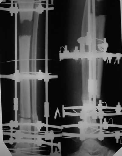 Женщина 46 лет, неудачно лечившаяся по поводу перелома голени в нижней 1\3 сначала в гипсе, поступила через 6 месяцев после остеосинтеза пластиной (рис 1). Имелась деформация в нижней 1\3 голени: варус, антекурвация, наружная ротация, два свища. Удалена пластина, дебридмент мягких тканей,