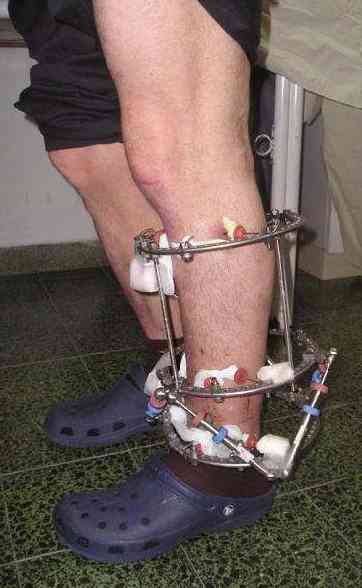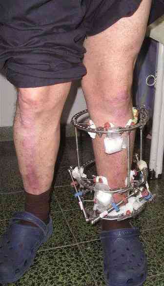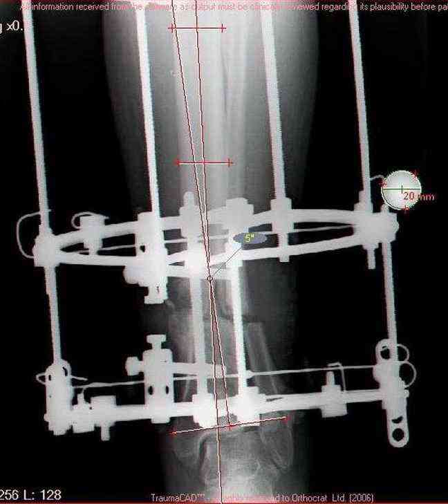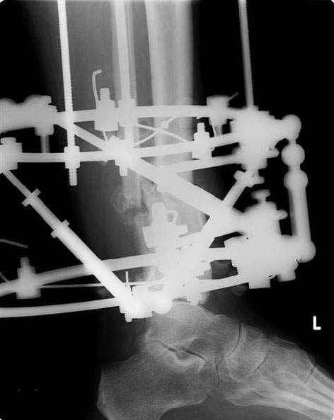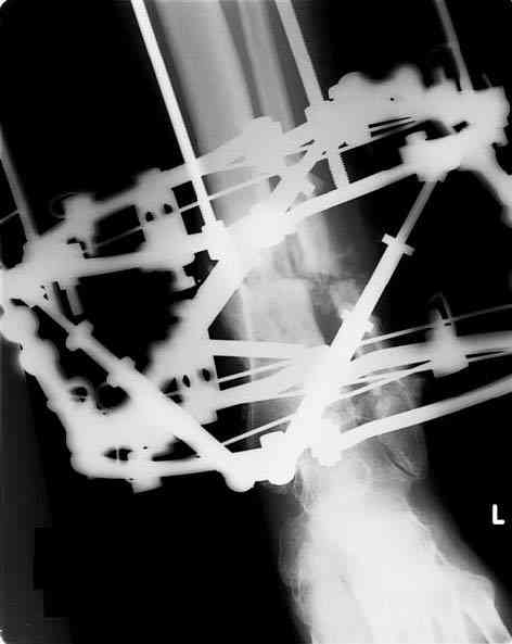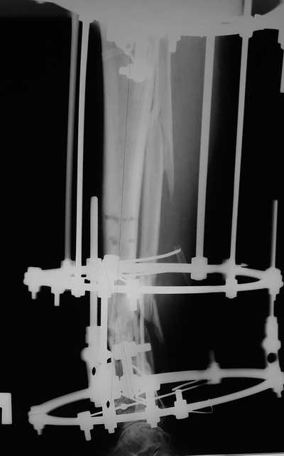Male 54 years old, diabetic, blind in both eyes, with infected (MRSA) non union distal tibia after fracture 8 month ago. In acute phase treated by ORIF with LCP tibia and fibula. Treatment complicated by infection and after 6 month hardware was removed and treatment continued by cast fixation. You can see malposition of fragments In this stage beginning treated by Ilizarov fixation with use Hexapod system, allows anatomical position of fragments and you see signs of union.