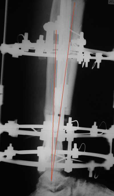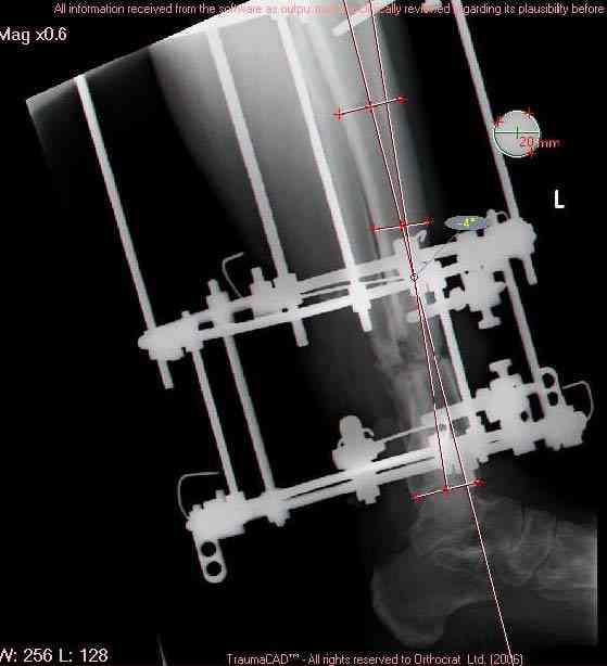 остеотомия м\б кости, аппарат Илизарова. По рентгенограммам в двух проекциях произведено планирование устранения смещений (рис 2 и 3), между вторым и третьим кольцом установлены 6 телескопических дистракторов Гесапода, данные введены в программу, и далее втечение 10 дней больная подкручивала телескопы согласно выданной компьютером инструкции. По завершению репозиции гексаподные телескопы обратно заменены на обычные штанги от аппарата Илизарова (рис 4 и 5). Еще через две недели забит гвоздь (рис 6, контроль