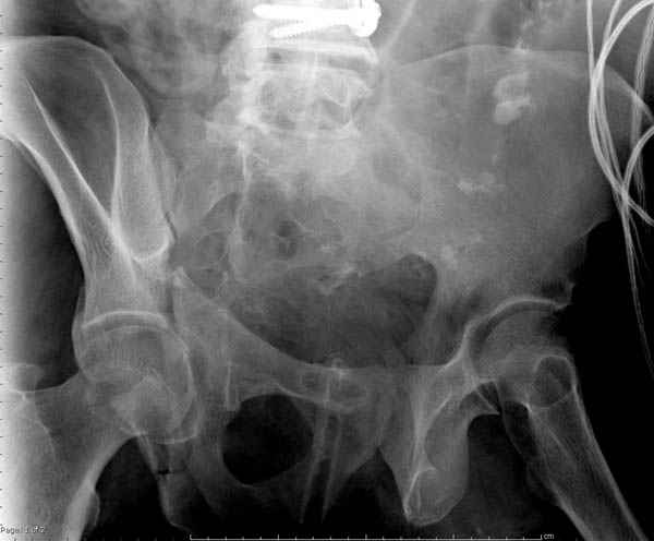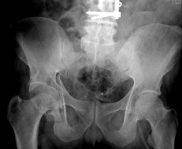 Из-за большого обьема конечности доступ к бугорку был затруднен, предварительно зафиксированный шуруп не удержал бугорок, поэтому фиксацию провели толстыми нитками. Состоятельность фиксации бугорка обычно проверяем во время операции, под рентген контролем проводится движения конечности, особенно приведение.
