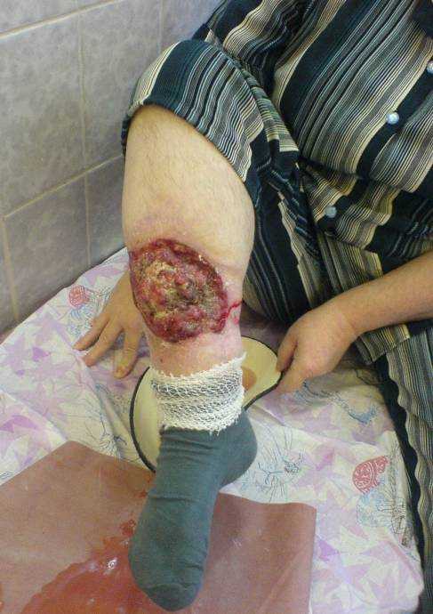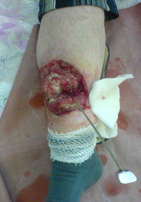 Сегодня принял больную, женщина 51 года.Травма автодорожная 13 лет назад. Тогда же - остеосинтез левого бедра стержнем (сращение); ампутация левой голени на уровне с/3 (опротезирована); открытый перелом с/3 костей правой голени (лечение в аппарате Илизарова). Три года назад появился свищ на передней поверхности голени, лечилась нерегулярно и на сегодняшний момент вот такая картина. Перед госпитализацией, без назначения врача принимала тетрациклин в течение 10 дней. Взяли посев, заказали дополнительные снимки, перевязка. Правый коленный сустав - движения с полной амплитудой. Частичная нагрузка на правую ногу при ходьбе. Пульсация на a. d. pedis сохранена, стопа теплая. Не температурит. Общее состояние удовлетворительное. Рана с обильным гнойным отделяемым со зловонным запахом на фоне гипергрануляций. Из свища определяю геморрагическое отделяемое. Снимок месячной давности. Фистулография запланирована на след. неделю. Что можно выполнить этой пациентке на уровне районной больницы? Планируем: коррекция оси в аппарате, дебридмент, резекция б/берцовой кости с острой копрессией для закрытия полости с бусами из цемента с а/б. Есть гадкое предчувствие, что "вылезет" MRSA на посеве.Надеюсь на помощь в тактике лечения данной пациентки у опытных коллег.