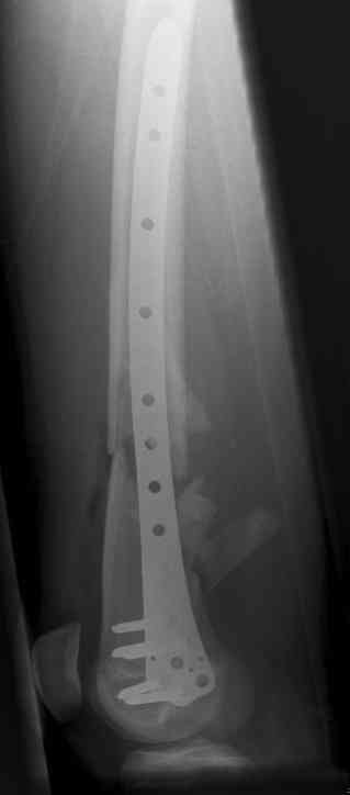 The wire track infection of external fixation is common and don’t realize the rigid fixation, so I gave up it. LC-DCP is capable of compressing the fracture, but it need the wilder strip of soft tissue.Maybe LISS is the another choice, but it also don’t compress the facture effectively.