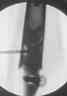 Подвели и одели на конец отломка устройство с определенными техническими трудностями( проводник пришлось изогнуть, упиралось при входе в заднюю стенку, что значительно усложнило его последующее вращение, несколько раз удаляли устройство, т.к. полностью утрамбовывалось костной стружкой ) совместили отверстие на втулке и штифте и заблокировали отломком винта ( винт заранее надпилили по диаметру втулки и обломали после введения). Отломок удалился без проблем.