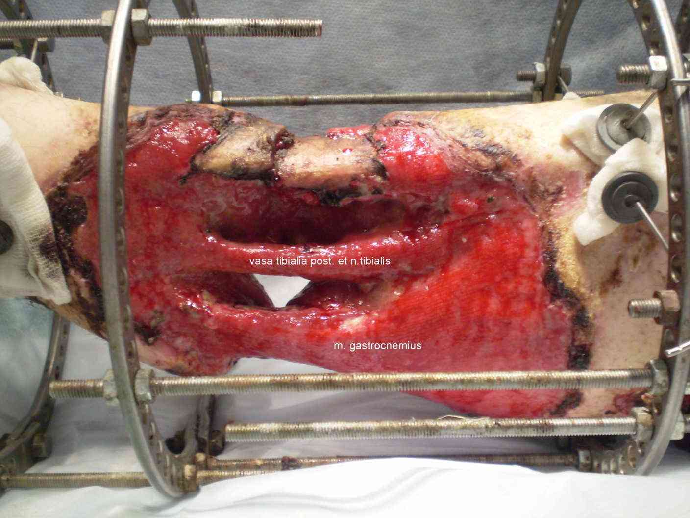Мне кажется, здесь вопрос не в пластике, а в том, что обнаженная кость некротизирована. Если пробовать спасти конечность, то для начала надо делать хирургическую обработку, резекцию кости, пробовать восстановить хоть какую-то анатомию, дальше заживлять мягкие ткани и потом удлиннять голень в аппарате. Путь долгий, тяжелый и с не определенным финалом. Покажу картинку нашим травматологам.
