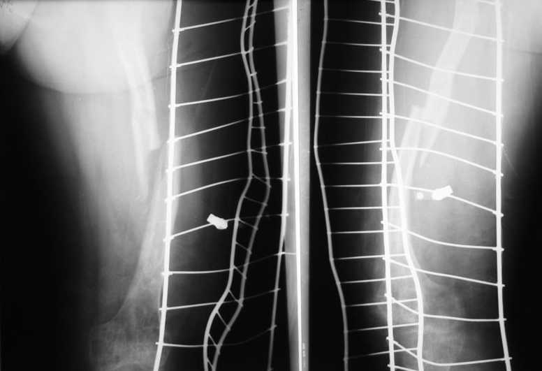 Еще одна проблема - ось бедра не на всем протяжении будет совпадать с осью гвоздя. Хотя канал можно и кривой сформировать, гвоздь в него потом не ввести. Это более менее легко решается чрескожной остеотомией или несколькими, прямо по ходу введения гвоздя.