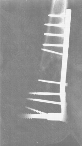 Пациент 11 месяцев назад получил сочетанную травму в ДТП. Самое тяжелое повреждение это закрытый многооскольчатый внутрисуставной перелом дистальной трети левой бедренной кости. Оперирован- на операции море мелких осколков, разлетелись мыщелки, произведен остеосинтез динамическим бедренным винтом с пластиной, достигнута хорошая компрессия между мыщелками, хорошее их сопоставление в суставе, и хорошая жесткая фиксация к бедру. Очень извиняюсь за качество снимка- никак не могу привести их в читабельный вид (качество их сильно хромает в госпитале). После операции долго лечили лигатурные свищи. Сейчас на контрольных рентгенограммах консолидации просто нет, в надмыщелковой зоне имеется дефект кортикала и губчатого вещества, хотя на операции все это было забито костной крошкой. И теперь что делать дальше?? Мнения такие: металлоконструкцию не менять, произвести костную пластику по Хохутову на передней поверхности бедра,и наложить хорошую гипсовую повязку, либо наложить аппарат внешней фиксации, и убрать динамический винт, и вести его дальше в аппарате. Благодарю всех кто поможет и еще раз извините за снимок, который, скорее ничего полезного не даст. С уважением Кавецкий.