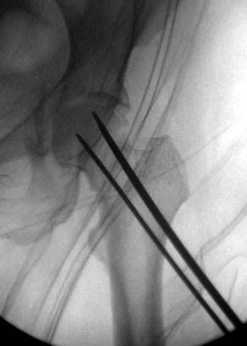 В данный момент скелетное вытяжение поучается через перелом шейки, а фиксированный перелом шейки будет участвовать в процессе вытяжения через каннюлированные шурупы.