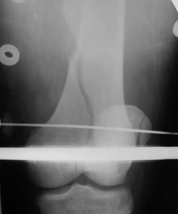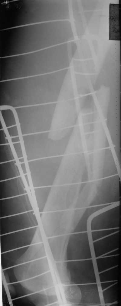 Заранее приношу извинения за качество снимков. То что есть - либо из ЦРБ, либо сделано в приемном покое, где дежурят рентгенлаборанты различной квалификации. Завтра постараемся сделать снимки всего бедра на длинные кассеты в 2 проекциях. Сейчас больной на скелетном вытяжении. Состояние стабильное.