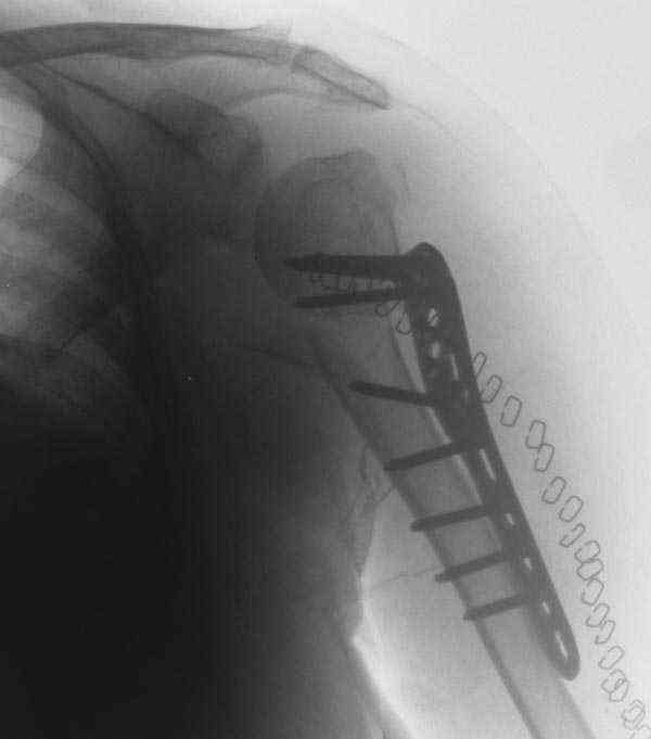 The reduction is not perfect. The patient is very small made, and it was difficult to bring the plate proximally without impingement in abduction.