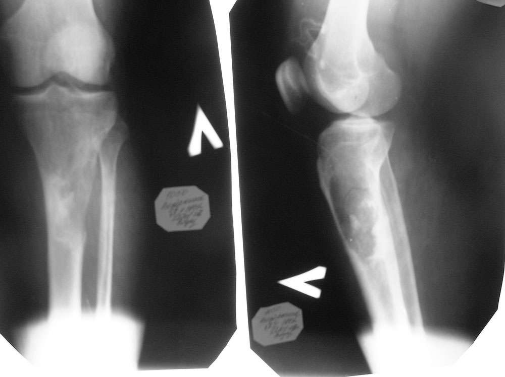 На рентгенограммах в области проксимального мета-диафиза б/берцовой кости больше латерально определяется значительных размеров остеолитическая деструкция с нарушением кортикального слоя и выходом "мягкотканного компонента" патологического образования за пределы кости. Медиальнее участка деструкции зона остеосклероза.