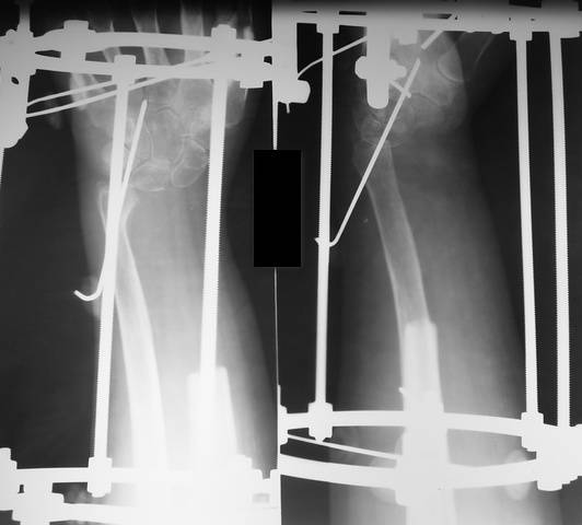 Выполнена краевая резекция с замещением гидроксиапатитом. В сентябре 2007г. рецедив опухоли с бурным ростом. Выполнена резекция н/3 лучевой кости с фиксацией в аппарате. Дефект 11см. На контрольных рентгенограммах (9.01.08) роста опухоли не наблюдается. Вопрос: чем заполнять дефект?