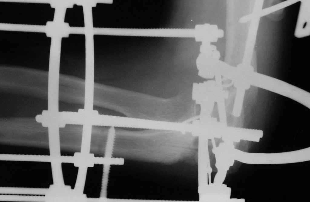 Коллеги! Сделана операция. Убрана рубцовая ткань, освежены концы до "кровяной росы", произведен релиз локтевого отростка и заднего отдела сустава - прошел до венечного отростка. После адаптации отломков выяснилось, что полное сопоставление происходит только на 1/4 периметра. Уложены аутотрансплантаты взятые из крыла подвздошной кости. Приведена схема. Через локтевой отросток проведены две спицы с упорными площадками с разбросом в 1 см, закрепленные на отдельном полукольце. Дана компрессия. Пятые сутки, рана заживает первичным натяжением. Выписываю. На 14 сутки буду пробовать движения.