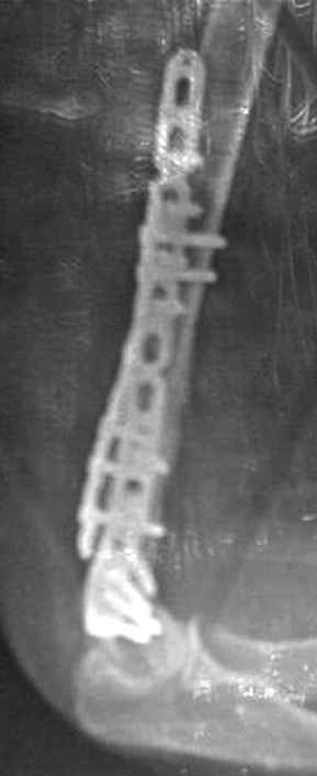 Через год по поводу тех же проблем сделали ревизию, оригинальную пластину оставили как есть, только укрепили добавлением еще одной пластины и сделали костную пластику.