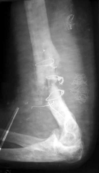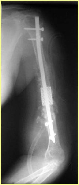 Лечение вторичного ложного сустава плеча особенно в дистальных отделах очень трудная задача. Результат несостоятельного остеосинтеза, приведший к ложному суставу осложнен коротким дистальным склеризированным участком и полным отслоением от мягких ткани в дистальном отделе плеча.