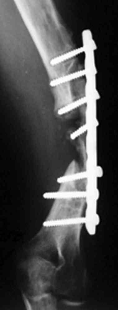 Преконтурированная длинная Locking пластина латерально и вторая под 90 градусов к ней, медиальнее сзади с достаточным количеством аутокости из крыла создаст нужную стабильность и условия для скорейшей разработки движения в суставе.
