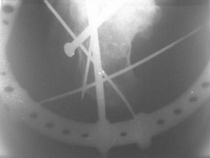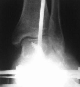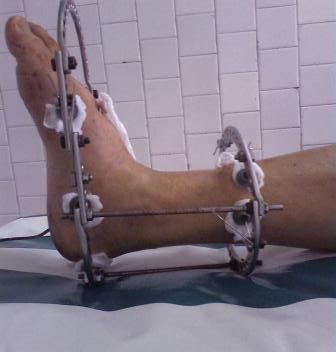 28.02.08г. произведен трехсуставной артродез таранно-пяточного, таранно-ладьевидного и пяточно-кубовидного суставов, с клиновидной остеотомией пяточной кости, с заполнением синуса костными осколками. Фиксация таранно-пяточный стягивающим винтом, таранно-ладьевидный и пяточно-кубовидный спицами, варусная деформация стопы устранена. Для наблюдения за состоянием раны и стопы а также для фиксации и поддержания напряжения произведен к/остеосинтез аппаратом Илизарова.