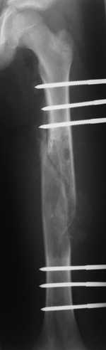 Most likely fibrous dysplasia, we had the same case but younger age patient 4 years ago treated by uniplanar ext fix followed by percut. curretage and bone marrow injection and healed well.