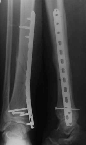 Если есть ЭОП, то перелом подходит для малоинвазивной фиксации. Репозиция суставного отдела (использовать репозиционные щипцы)и его фиксация стягивающими винтами чрезкожно, затем пластина медиально малоинвазивно, лучше метафизарная. Если не располагаете подходящим имплантом или непозволяют мягкие ткани, вполне возможно применить вместо платы Fix.Ex.