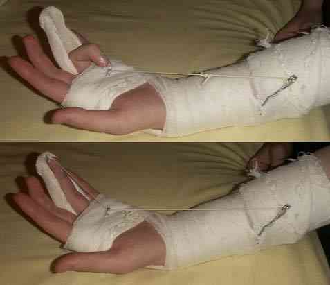 Использованные материалы: гипс больничный обыкновенный, проволока стальная 2 мм, лавсановая нитка №6, кантик от резиновой перчатки, прозрачные пластмассовые накладные ногти с просверленными в них дырками, клей для накладных ногтей, бинт марлевый обыкновенный.