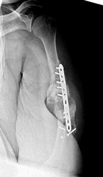 Помогите, пожалуйста, определиться с тактикой!Поступил больной с ложным суставом плечевой кости... Перелом был 2 года назад. Лечился в аппарате 8 месяцев, консолидации не произошло. В феврале 2007 выполнена костная аутопластика, фиксация пластиной (на базе одной из ИК). Сейчас сохраняется ложный сустав, плечо укорочено на 3 см, контрактура обоих смежных суставов, атрофия мышц плеча и плечевого пояса справа. Явлений остеомиелита не отмечалось. Больной - осужденный, сидеть ему до 2012 года.