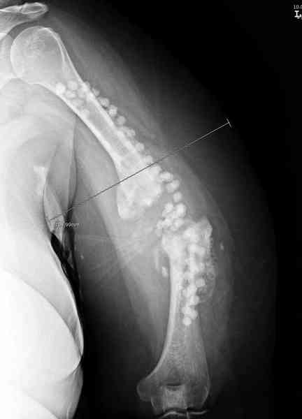 После промывки и дебридмента для уверенности уложили антибиотический цемент. Культура из раны в последующем была отрицательная.