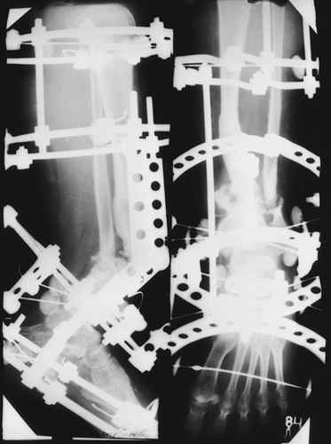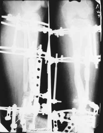 На первом этапе аппаратом Илизарова закрыто устранена деформация голени.