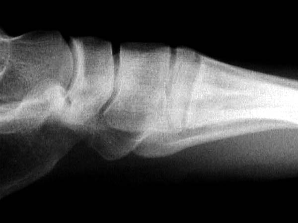 По первому снимку, не видя больного, мог бы заподозрить перелом основания 3-й плюсневой кости. Поэтому избрал бы тактику консервативного лечения, как при переломе плюсневых костей без смещения!