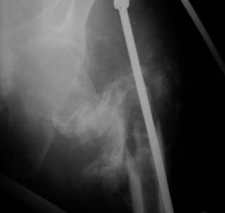 Остеосинтез: не очень хорошо виден весь прокисмальный отломок - чем больше пенек ниже большого и малого вертелов - тем более эффективней будет интрамедуллярный остеосинтез например Y-Nail, но угол надо подобрать больше 135 гр для коррекции длины, больше угол - длиньше нога, примерно 10 гр = 1 см. Если проксимальный отломок заканчивается сразу за малым вертелом или латеральнее выше, то следует примерить пластину типа LISS or LSPDF, но лучше та, где отверстия не совмещенные, а одинарные. На операции дистальный отломок отводите под нужным углом 150 гр, к примеру, вводлите 5 винтов в проксимальный отдел = вертела и шейка, затем с торцевой компрессией фиксируете 8-и т.д. винтами диафиз к пластине. После приведения ноги - длина должна быть одинакова, сустав по-моему вполне жизнеспособен. Теперь остается тлько защититься от вторичного нагноения: был ранее в Росии Touralin - сильно помогал, ну а теперь - антибиотики - местно и в огранизм, стабильный остеосинтез, достатоточная гемоперфузия отломков. Пластического материала для осётеогенеза мне кажется там хватит, его можно измельчить и смешеть с анибиотиками - депо и того и другого. и Как говаривал Н.И. Пирогов:"операцию мы сделали, а теперь Бог вылечит!".