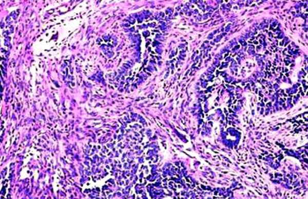 A potential trap is created by a radiologic impression of an aneurysmal bone cyst and the characteristic gross features of that cyst. However, examination of the cyst lining reveals overt malignant cells, often with increased mitotic activity (see Image 2). These cells may lie adjacent to the benign osteoclastic giant cells. In some cases, these giant cells are numerous, and the tumor mimics a giant, cell-rich osteosarcoma (see Image 3). Unlike an aneurysmal bone cyst, telangiectatic osteosarcoma has an osteoid matrix that is delicate and lacelike in appearance. Also, the stroma between the dilated vascular spaces often contains malignant cells."