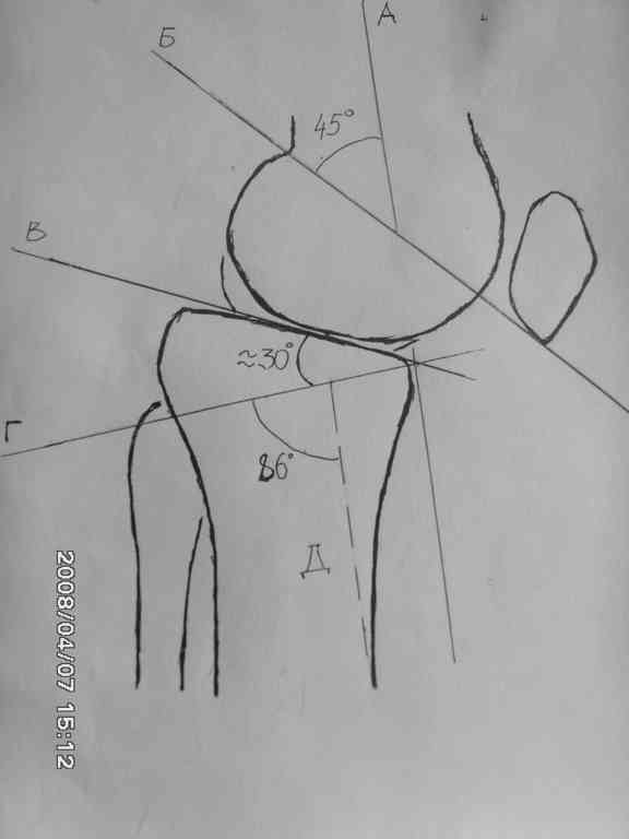 86 гр. (Г-Д) отношение суставной полверхности к оси голени.