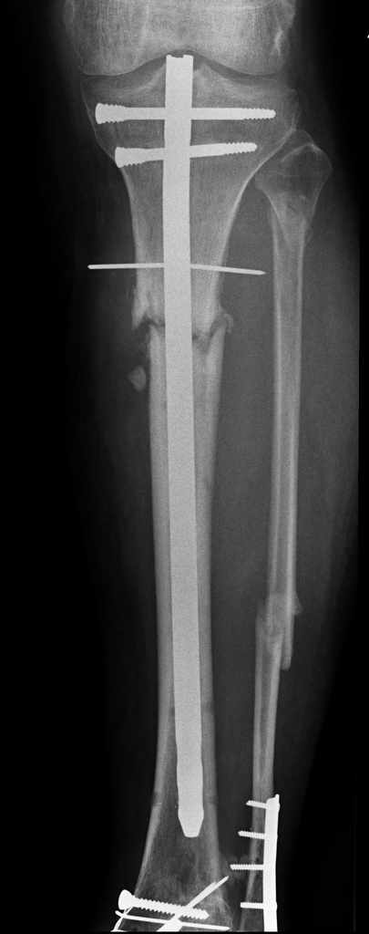 На третьем этапе - ещё через 3-4 недели , в случае если нет признаков инфекции выполняем остеотомию большеберцовой кости для восстановления длины сегмента в случае, острого укорочения, или костного транспорта для восстановления деффекта.