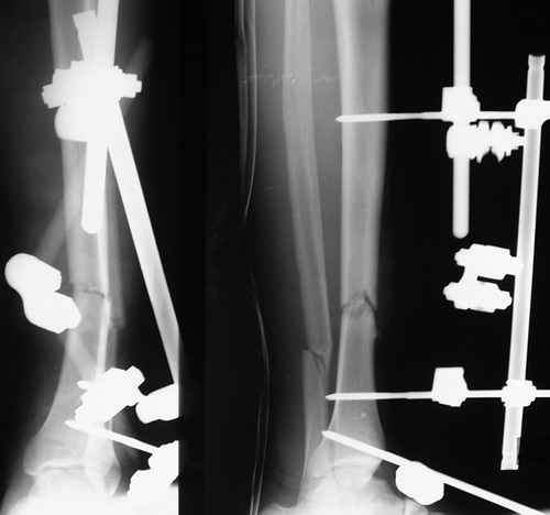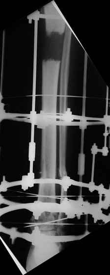 На втором этапе - через 3-4 недели выполнить повторный дебридемент,адаптировать хорошо концы отломков, удалить все остальные внутренние фиксаторы,убрать участок м/б кости, наложить аппарат Илизарова и сделать острое укорочение.Аппарат должен быть очень стабьльный. Если удастся на проксимальный фрагмент наложите 2 кольца, 5 спиц. Или одно кольцо с 3 спицами и 2-мя стержнями Шанца. И 2 кольца на дистальный фрагмент. Имейте ввиду, что острое укорочение вызывает гофрирование мягких тканей и может привести к нарушению кровообращения. Поэтому в случае исчезновения пульса на артерих стопы, необходимо проверить доплер сигнал. Есоли есть доплер сигнал, сосудистые нарушения ограничиваються спазмом, что очень часто при таких операциях!!! Если доплер сигнала нет, надо вернуть частично длину назад, оставив при этом некоторое растояние между отломками. В послеоперационном периоде продолжаем антибиотики.