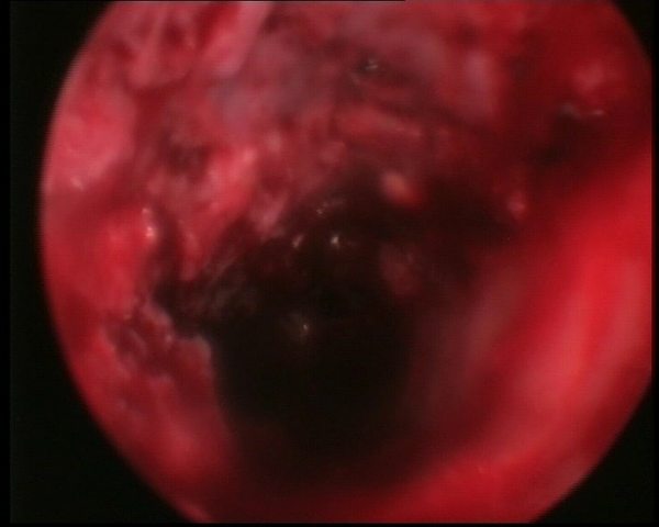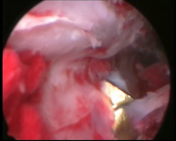 Определенным подспорьем в решении вопроса о жизнеспособности кости (а это определить часто очень сложно) может служить эндоскопия костно-мозгового канала (медуллоскопия), которую мы пробуем выполнять в подобных ситуациях. При высоких переломах голени это сделать не сложно (рис. 1, данная фотография взята из зарубежной статьи). Можно использовать лапароскоп (мы так и делали), урологический цистоскоп, артроскоп. После удаления штифта перед рассверливанием канала эндоскопия малоинформативна, так как поверхность кости закрыта патологическкими грануляциями и соединительнотканными разрастаниями в виде бахромы (рис. 2, виден конец канюлированного винта, через который мы вводили жидкость в костно-мозговой канал). Однако после рассверливания канала можно хорошо видеть участки кости, которые имеют серый цвет и не кровоточат, или же наоборот, имеют вид жизнеспособных (рис. 3). Манипуляцию целесообразно делать под жгутом на бедре. Наилучшая визуализацию обеспечивает постоянное промывание жидкости через костно-мозговой канал.