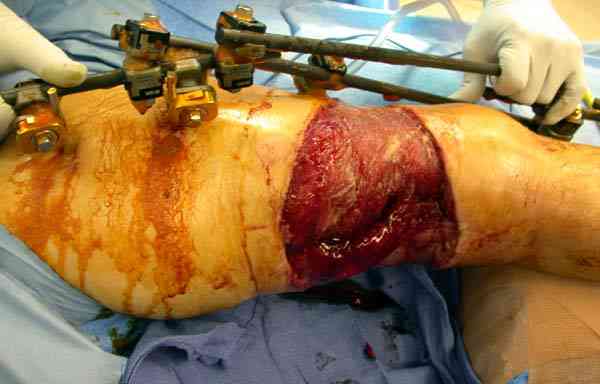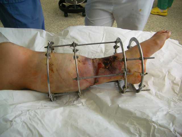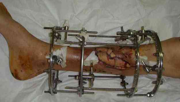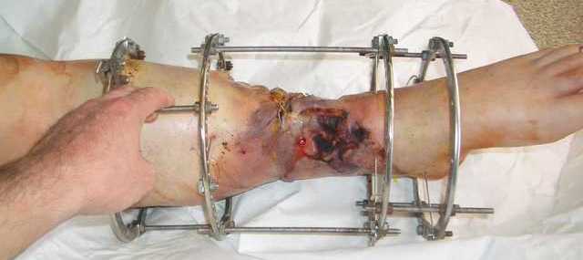 Огнестрельный дефект костей и передней группы мышц, поступил с юнилатеральным аппаратом, стабильность плохая, из раны обильное гнойное