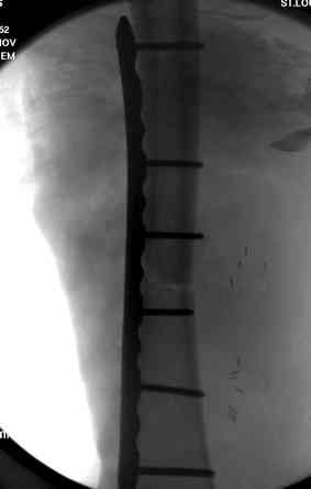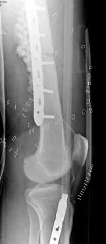 здесь случай с политравмой, перелом зафиксирован наружным фиксатором, после третьей irrigation&debridment фиксация бедра пластиной с последующей кожной пластикой.