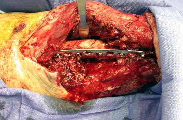 Открытые переломы, если имеется хороший доступ из раны можно сопоставить и зафиксировать первично пластиной, потому что несопоставленные переломы намного труднее репонируется в поздние сроки. Активизация больного за счет стабилизации кости благоприятно влияет на сращение, а также облегчается манипуляция по закрытию дефекта.