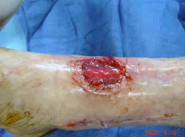 Таким образом подготовленный участок хорошо приживается засчет образования краевого кровообращения, особенно у пожилых и у больных с заболеваниями периферических сосудов. Через 10-12 дней лоскут повторно выделяется по заживающей линии и закрывается дефект, а на донорский участок кожная пластика.