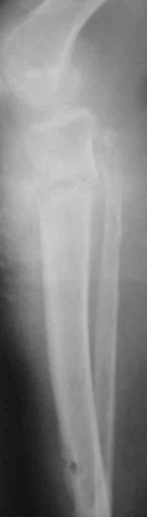 После травмы развились обширные эпидермальные пузыри голени и голеностопного сустава. После заживления ран произведено наложение аппарата Илизарова. П/о период без особенностей, больная поставлена на ноги (с ходьбой, естественно, проблемы). Наблюдалась на дому. Спустя месяц после операции отмечалось воспаление м/тканей области спиц проксимального базового кольца аппарата, отек в/з голени (больная передвигалась по дому на четвереньках!).Пришлось поменять кольцо на больший диаметр.Воспаление купировали. К концу второго месяца фиксации воспаление в области верхних спиц опять возникло, отделяемое сукровично-гнойное, незначительное. Проводилось местное лечение, отмечался умеренный отек голени в в/з, болезненность, гиперемии не было. Через три месяца после операции - клиническая проба, перелом сросся. Аппарат демонтирован. Спустя 4-5 дней после демонтажа отмечалась гипертермия до 39 в вечернее время. Раны кроме верхних зажили без проблем, верхние - в прежнем состоянии (незначительное серозное отделяемое).Проводилась АБТ, туалет ран, дренирование. Спустя 2 недели после снятия аппарата мать больной отметила появление подвижности в области коленного сустава. При осмотре - деформация голени в в/з (на уровне верхних спиц), подвижность на протяжении в/з, болезненность. Отек умеренный в в/з, гиперемии нет, гипертермия локальная умеренная.Коленный сустав отечен, жидкости нет. Сделали снимки (в приложении) - вот какая картина Больную госпитализировали - гипсовая лонгета, противовоспалительная терапия, взяли посев из ран. В анализах -лейкоциты до 8 тыс, сдвига формулы нет, СОЭ 42, но больная проходит курсы лечения бетафероном по РЭМ.