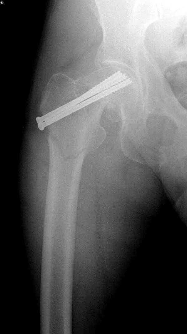 Профилактику дальнейшего раскола неполного перелома шейки провели тремя канюлированными шурупами.