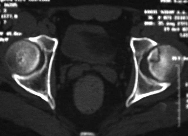 Мне представляется, что предоставлен случай аваскулярного некроза головки бедра. Для определения тактики лечения необходимо выполнить ренгенограммы лучшего качества и посмотреть все срезы на уровне головки. Предоставленные срезы -уровень ямки,т.е. малонагружаемой зоне, наличие в этой зоне участков сегментарного некроза скорее всего не приведет к деформации головки, при таком варианте разгрузка конечности на 3-4 мес может привести к благоприятному исходу.