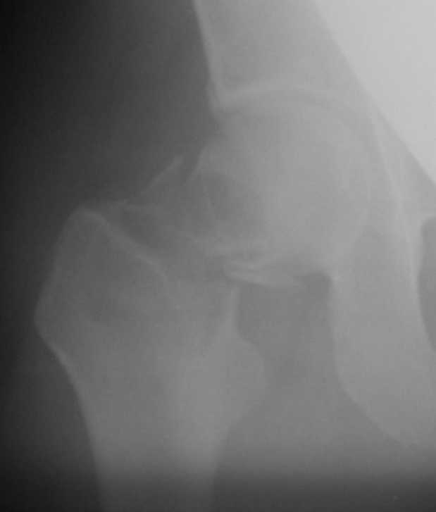 Приношу извинения, думал, что на прилагающейся рентгенограмме видно, что перелом произошел на месте обширной кисты, занимающей шейку и вертельную область. По характеру перелом многооскольчатый, дуга Адамса также представлена в виде осколков.