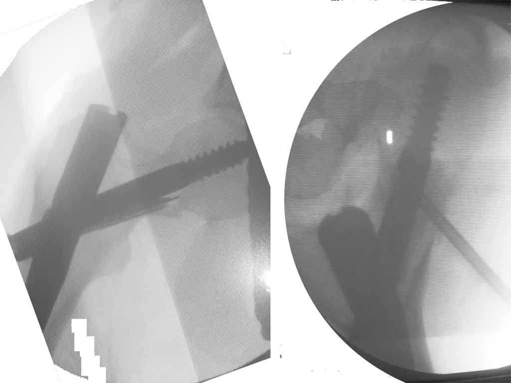 Приносим извинения за молчание. Больная прооперирована: под контролем ЭОП (защита плода несколькими халатами) выполнена закрытая репозиция на ортопедическом столе и фиксация Stryker Gamma 3 nail. Послеоперационные рентгенограммы мы решили не делать, чтобы не давать и без того чрезмерную нагрузку на плод. Поэтому придется довольствоваться картинкой с ЭОПа, правда сделанную на неподходящий для таких условий съемки фотоаппарат.