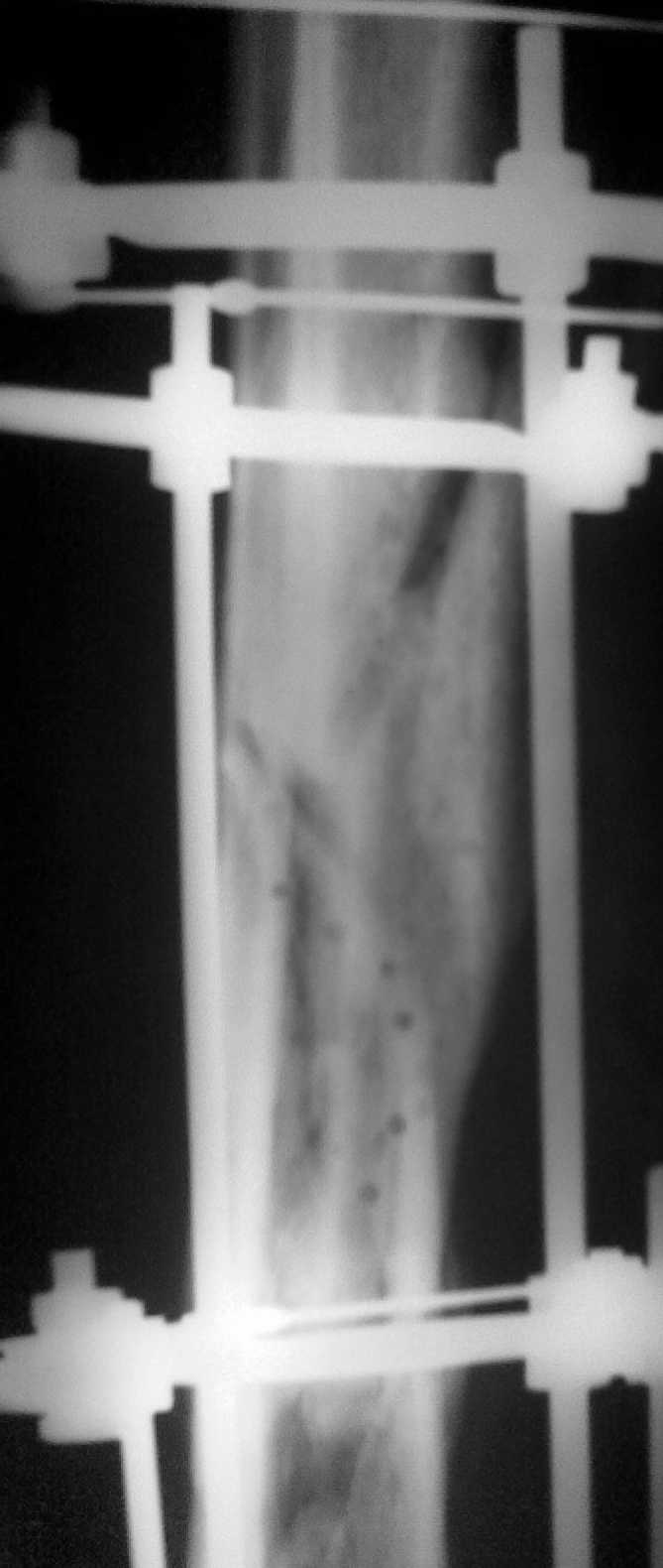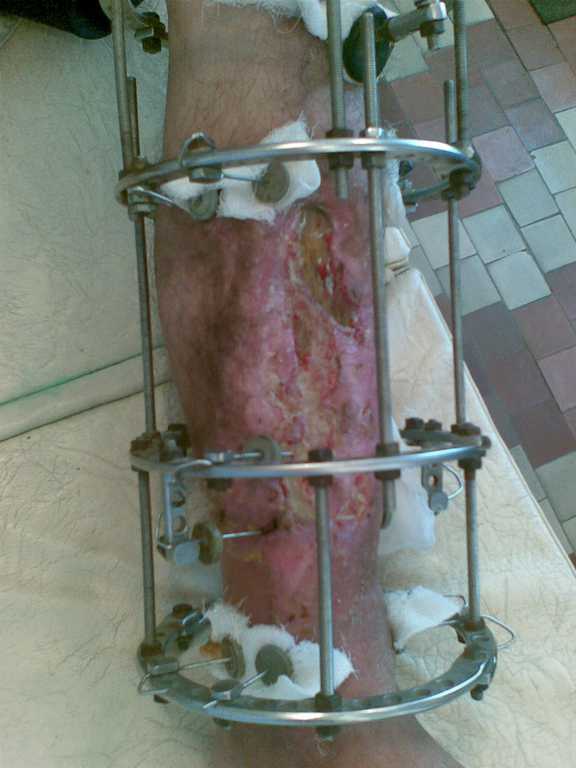 Если нет возможности направить пациента на микрососудистую пластику или другое дорогостоящее вмешательство, рассмотрите вариант обширной резекции некротизированной кости с последующим закрыитем мягкотканной гранулирующей раны расщепленным трансплантатом. При сохраненной аппаратом длине голени подтяните оба фрагмента большеберцовой кости к фибуле и дождитесь консолидации. в дальнейшем пусть ходит с ортезом до перестройки фибулы, это все-же лучше протеза.