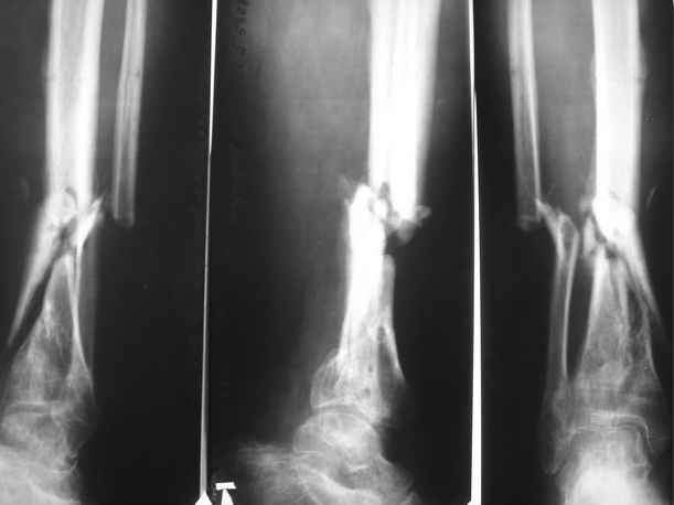 При развитии посттравматического остеомиелита большеберцовой кости всегда имеется поражение ее участков, радикальное удаление которых приводит к появлению (увеличению уже имеющихся) дефектов кости. Последние, как правило, сочетаются с дефектами или обширными рубцовыми изменениями мягких тканей в очаге поражения, что делает лечение пациентов данной группы еще более сложным. Наиболее важной общей причиной неудач традиционного лечения в этих случаях является резкое снижение остеогенетической потенции тканей в зоне ложного сустава. Поэтому патогенетически обоснованным методом лечения таких больных является сочетание остеосинтеза отломков большеберцовой кости с пересадкой в зону ложного сустава хорошо кровоснабжаемых тканей, а следовательно, и новых источников регенерации (резекция концов костных отломков и окружающих склеротически измененных тканей с последующей пересадкой кровоснабжаемого трансплантата из малоберцовой кости, предварительно выяснив состояние сосудов этой голени).