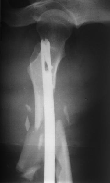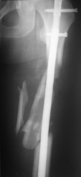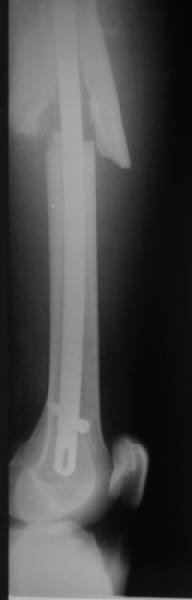 Мы бы не стали открывать, такие переломы срастаются, хотя бы и с краевым дефектом. То есть если удалять стержень потом, то сильно попозже обычного. В приложении пример. Сразу после операции и через 11 мес. Понятное дело, пациент к тому времени давно и не хромал, и функция колена была полная.