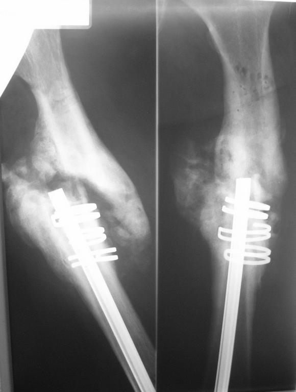Интересный пациент. Подробности бы насчет остеомиелита - локализация, распространенность... И снимок бедра с обоими суставными концами.