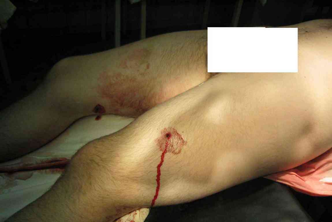 ПХО огнестрельных ранений с точечными входным и выходным отверстием без напряженной гематомы и повреждения элдементов сосудисто-нервного пучка не показано. Выполняются внешняя фиксация перелома и большеобъемные противовосалительные блокады по Рожкову плюс дренирование огнестрельных ран. Выполенние погружного остеосинтеза сомнительно.