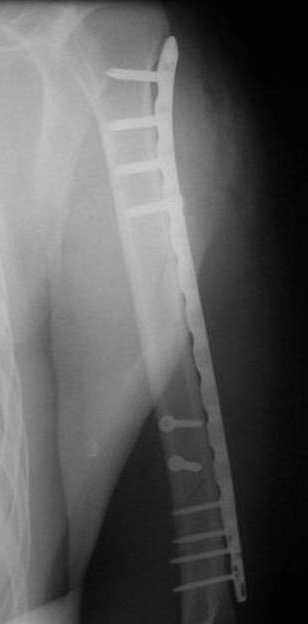 Пациент оперирован на 5-е сутки (переведен из другого лечебного учреждения)после сквозного пулевого ранения плеча и грудной клетки (непроникающее ранение той же пулей). Выполнен минимально инвазивный остеосинтез блокируемой метадиафизарной пластиной, повторная хирургическая обработка ран плеча. Заживление всех ран первичное, сращение наступило в обычные сроки.