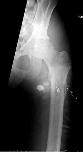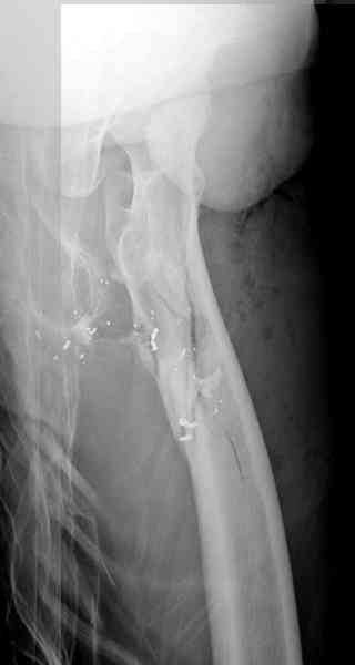 Несмотря на высокоэнергетический характер ранения, пуля не попала непосредственно в кость, а прошла рядом. Таким образом, для бедренной кости это ранение нельзя назватьв полном смысле этого слова высокоэнергетическим. К сожалению, не видно выходное отверстие. В любом случае, при таком переломе интрамедуллярный остеосинтез вполне показан. Кроме того, если пациент попал к Вам в первые часы после ранения, рана не должна рассматриваться как инфицированная. В качестве примера возможности даже более травматичной операции при таком характере перелома привожу следующий случай.